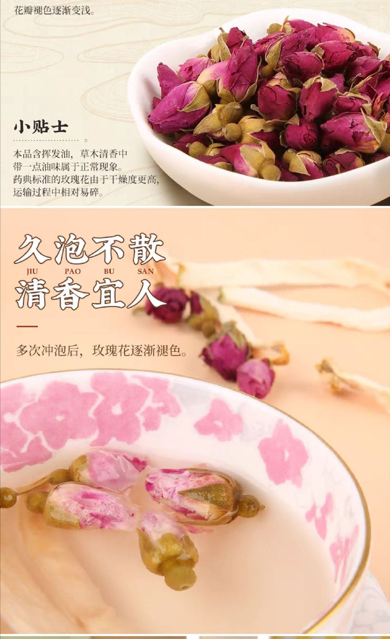 精選重瓣紅玫瑰,花香濃郁,沖泡后口感甘醇,舒緩身心