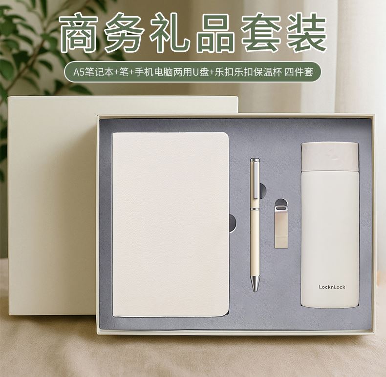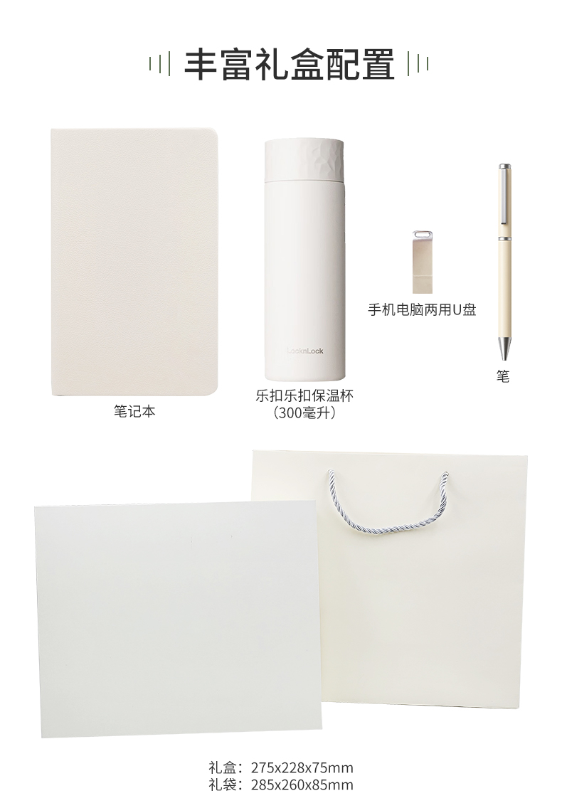 A6硬皮PU筆記本 金屬烤漆筆 旋轉(zhuǎn)手機(jī)電腦兩用16G U盤(pán)(Type-C/USB) LOCK&LOCK保溫杯 316內(nèi)膽300ml 包裝盒尺寸:275x227x75mm 手提袋尺寸:286x260x85mm 顏色:米白色 重量:25kg