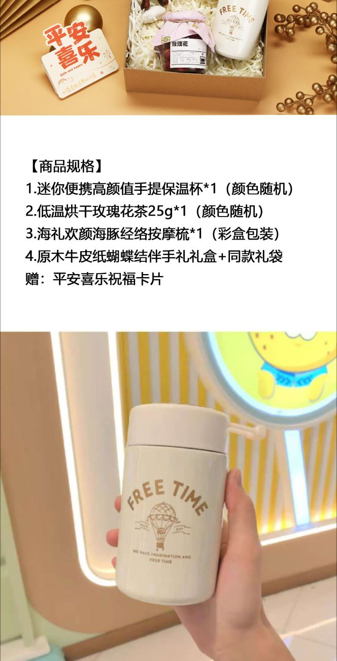 這款產(chǎn)品組合包括迷你便攜高顏值手提保溫杯、低溫烘干玫瑰花茶、海禮歡顏海豚經(jīng)絡(luò)按摩梳以及原木牛皮紙蝴蝶結(jié)伴手禮禮盒和禮袋。產(chǎn)品多樣且實(shí)用性強(qiáng),為您帶來便捷生活和美好心情。禮盒精美大方,非常適合送禮或者自用