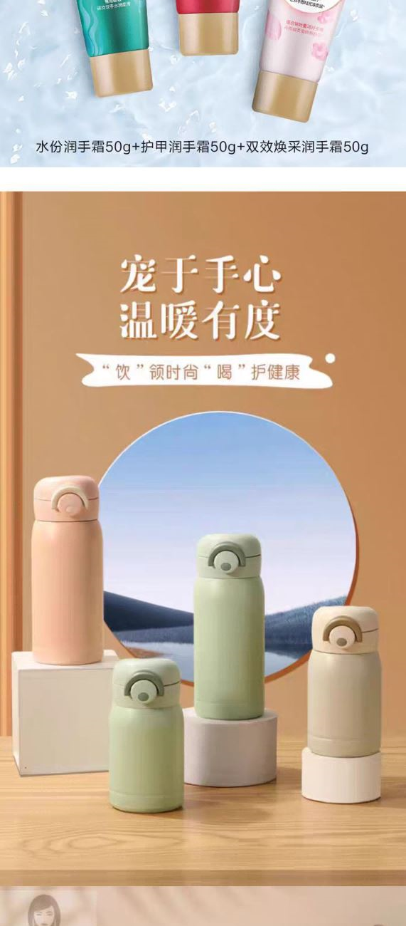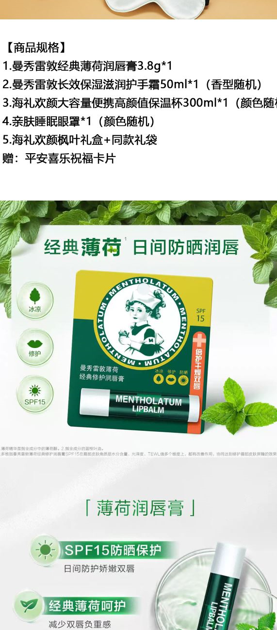 贈:平安喜樂祝??ㄆ?這套產(chǎn)品包括曼秀雷敦經(jīng)典薄荷潤唇膏3.8g、長效保濕滋潤護手霜50ml、海禮歡顏大容量便攜高顏值保溫杯300ml、親膚睡眠眼罩和禮盒。產(chǎn)品涵蓋保濕、防曬、護眼等方面,旨在為您打造舒適愉悅的生活方式。禮盒精美,適合送禮自用兩相宜。