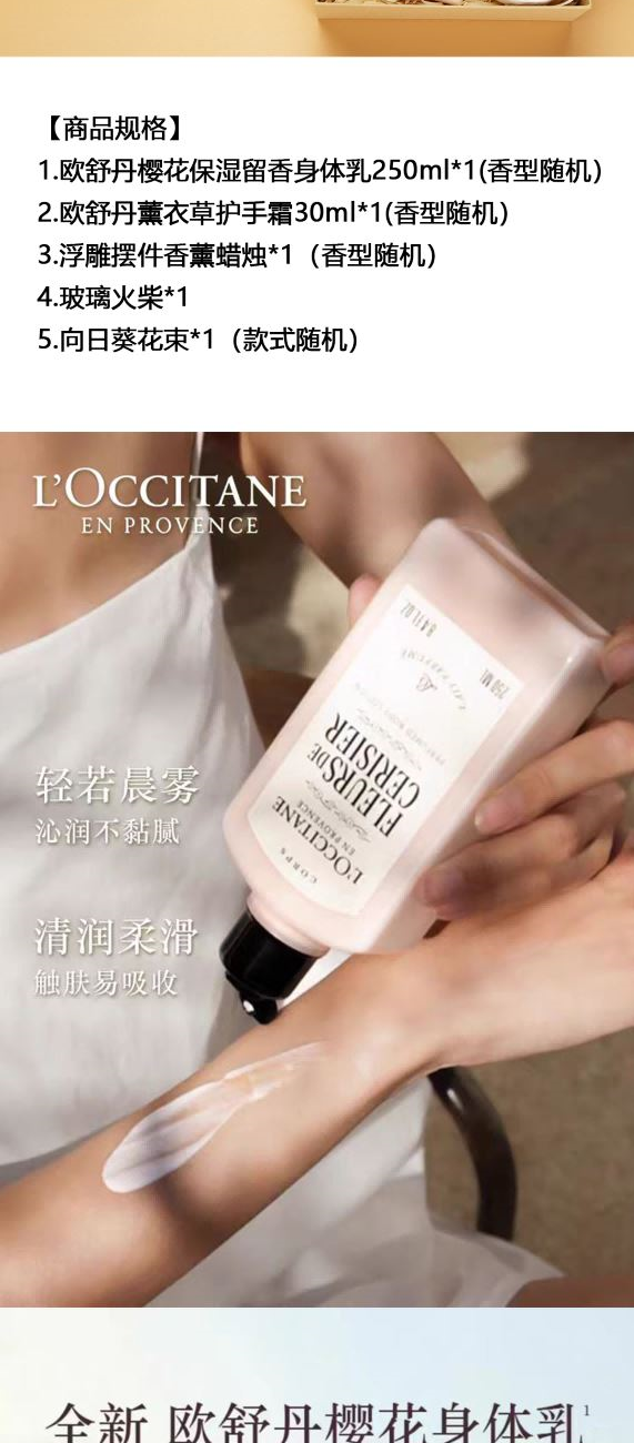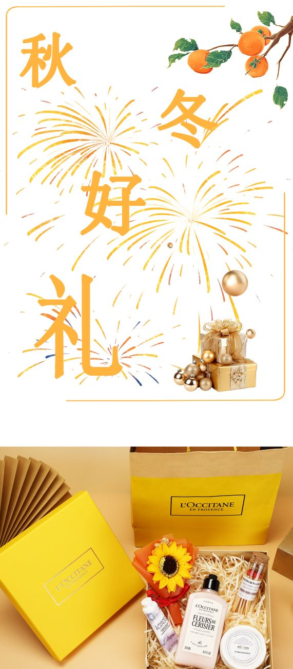 1.歐舒丹櫻花保濕留香身體乳250ml*1(香型隨機) 2.歐舒丹薰衣草護手霜30ml*1(香型隨機) 3.浮雕擺件香薰蠟燭*1(香型隨機) 4.玻璃火柴*1 5.向日葵花束*1(款式隨機) 這套產(chǎn)品包括歐舒丹櫻花保濕留香身體乳(250ml)、薰衣草護手霜(30ml)、浮雕擺件香薰蠟燭、玻璃火柴和向日葵花束。以自然、健康為主題,旨在為你的生活帶來更多關(guān)愛與舒適。